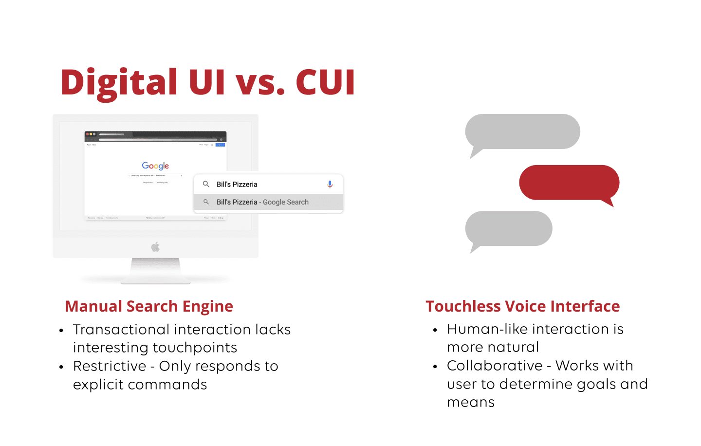 We started by asking: why use voice at all? Through comparative analysis, we found that conversational interfaces excel at collaborative problem-solving in ways that traditional search bars simply can't. While a search bar waits for commands, a voice interface can actually work with users to unpack their goals. CUIs are not simply a source of information, but a conversation partner who can help users think through complex, personal decisions.