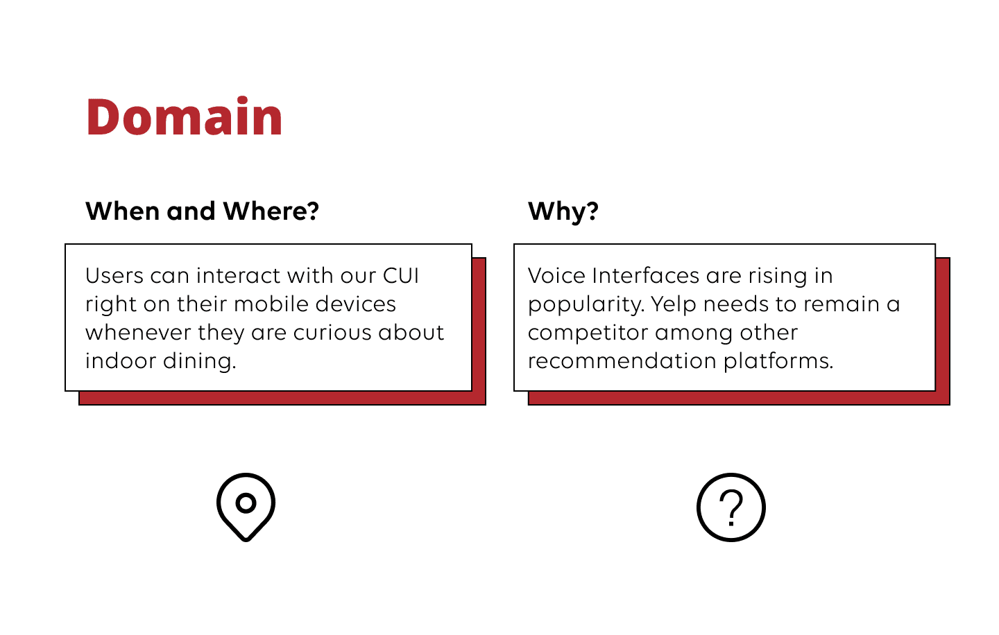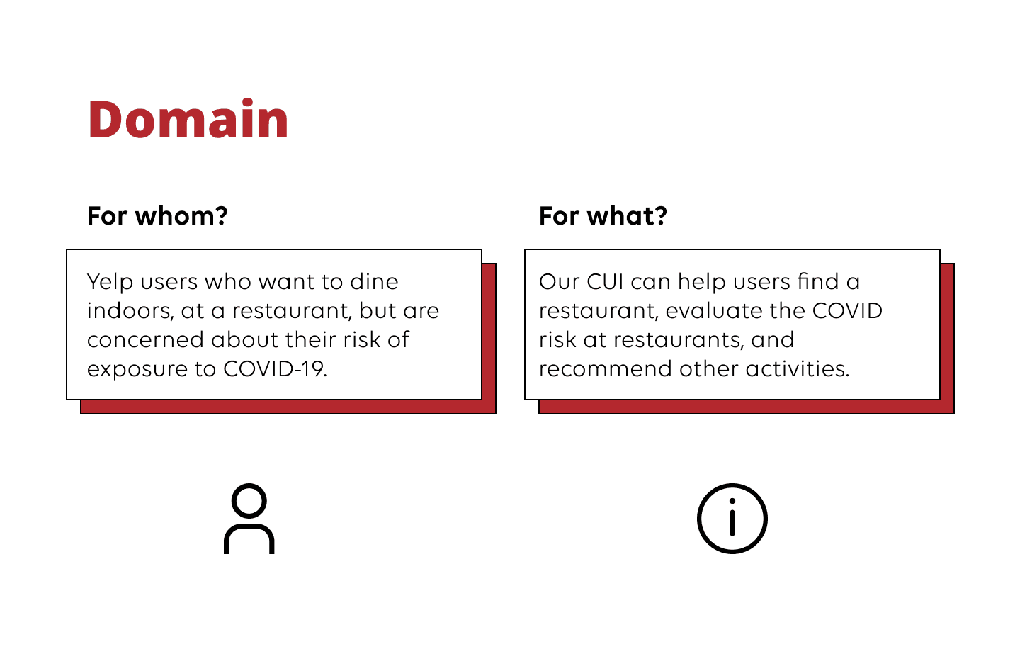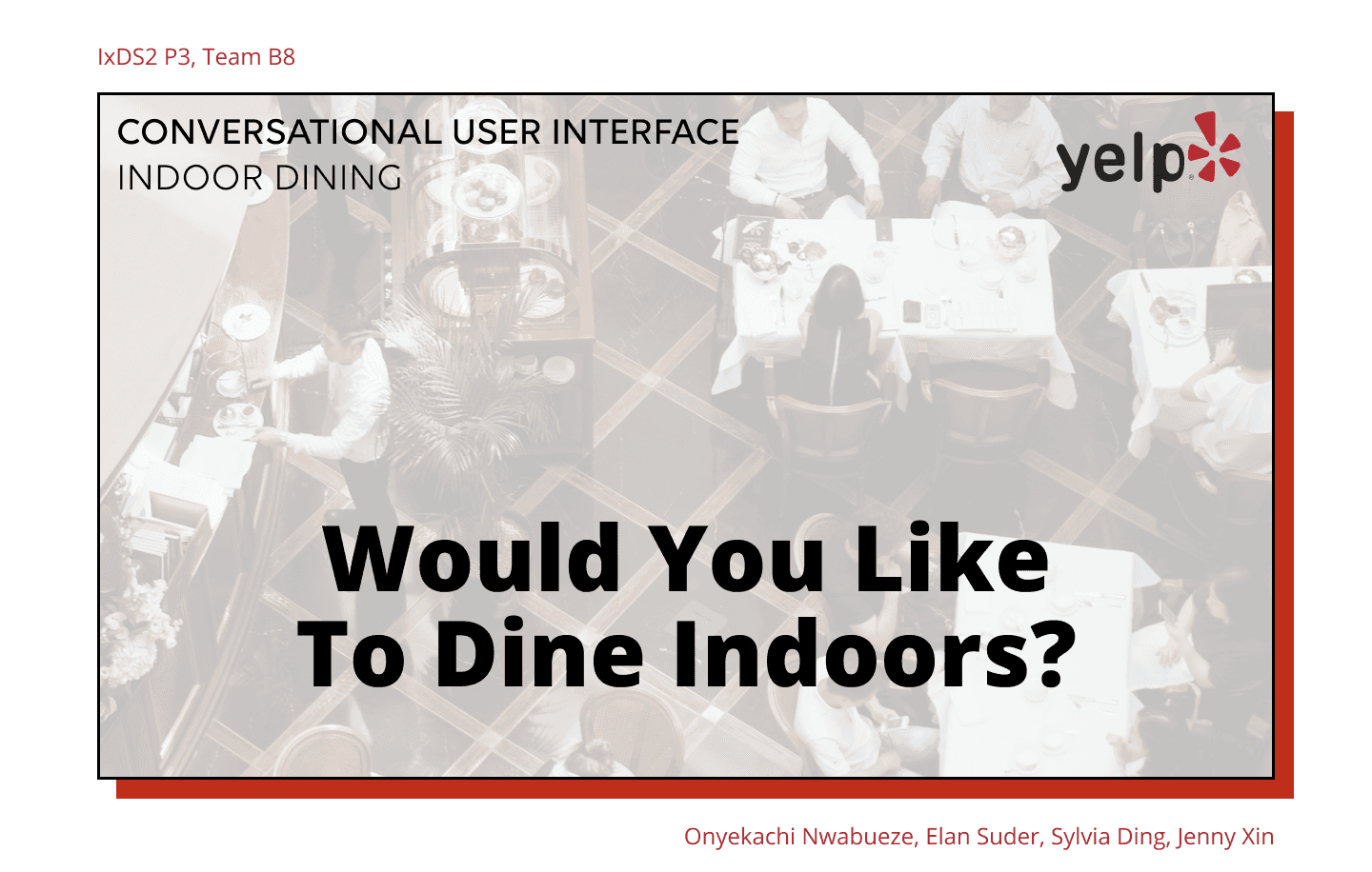 A conversational user interface (CUI) prototype designed to help users make informed dining decisions during COVID-19 by providing personalized risk assessments and recommendations. This academic project used Yelp as a practice case study to explore how voice design could transform restaurant discovery.